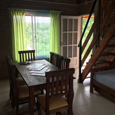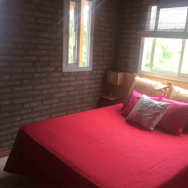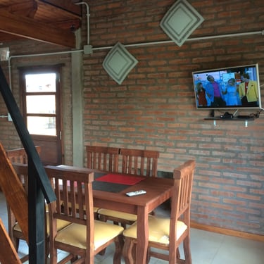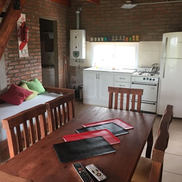 Esta encantadora cabaña está equipada para alojar hasta 6 personas, ideal para unas vacaciones en familia o con amigos. En la planta baja, encontrarás una acogedora habitación privada con cama matrimonial, además de un espacio común que cuenta con una cama con carrito para dos personas. La cabaña dispone de un sector de cocina completo, que incluye cocina, horno, heladera con freezer y calefón. Para tu entretenimiento, hay una televisión con DirecTV y aire acondicionado para mantener un ambiente fresco. En el primer piso, hay dos camas individuales, con blancos de cama incluidos, aunque no se proporcionan toallas. Ven y disfruta de una estancia cómoda y agradable en este espacio perfecto para relajarte y desconectar.